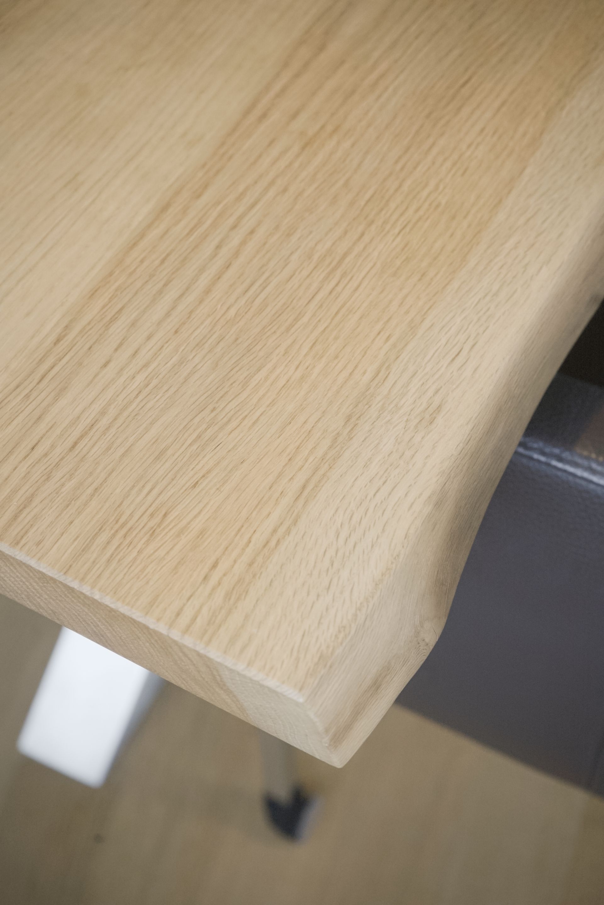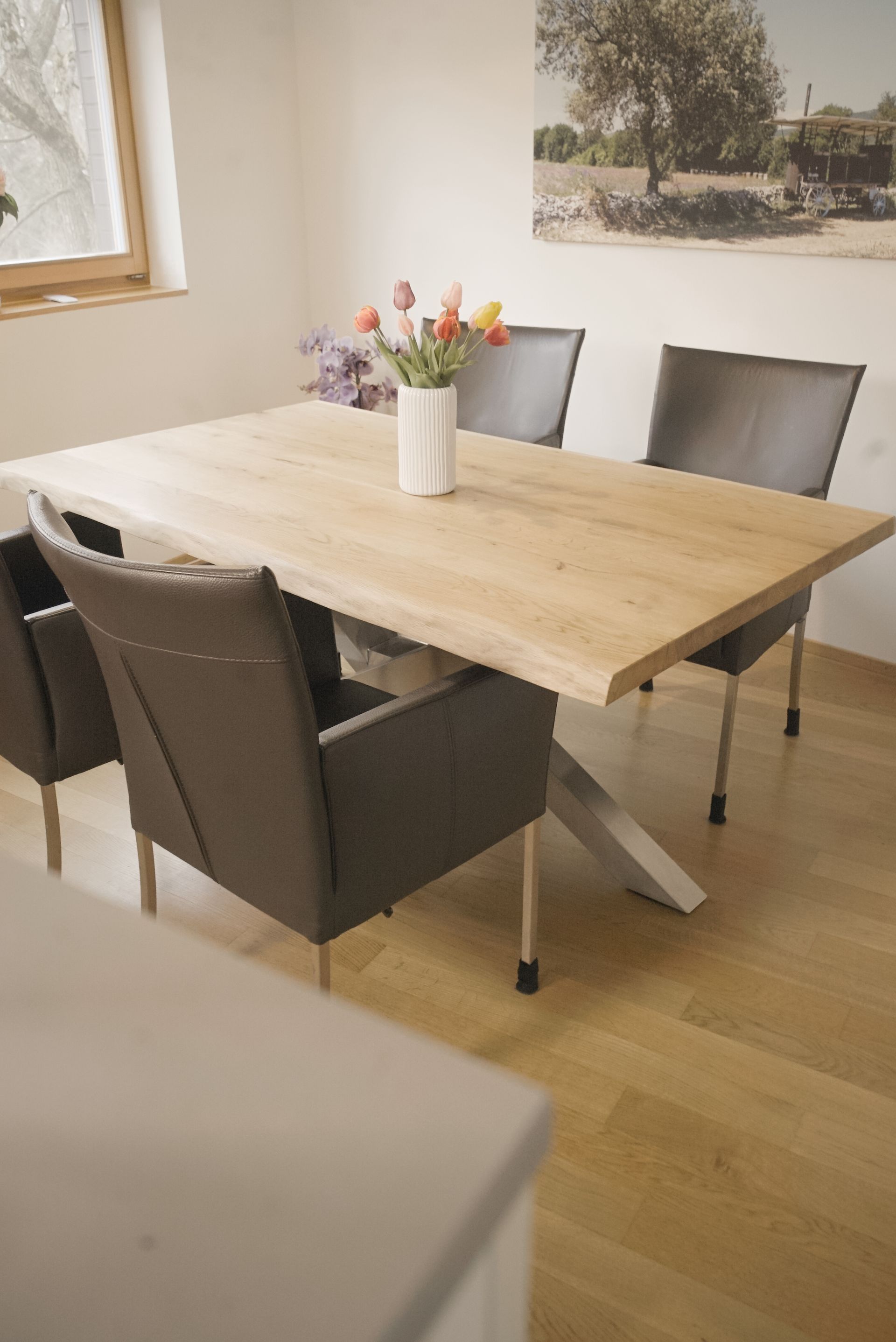 Die elegante Waldkante kombiniert mit dem stilvollen Edelstahlgestell bietet ein modernes und natürliches Ambiente.